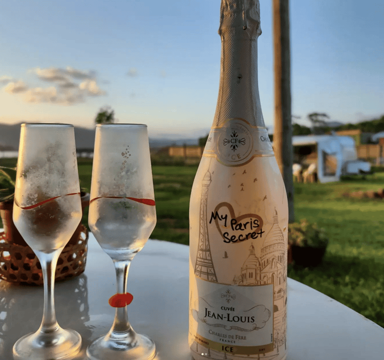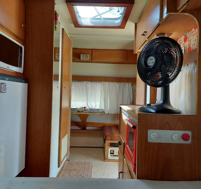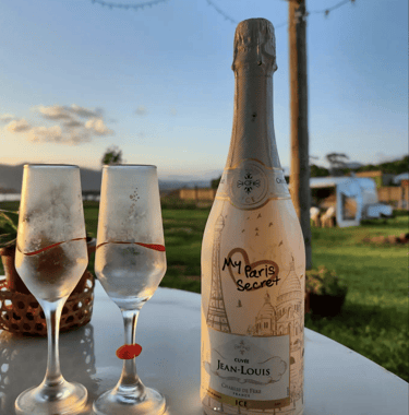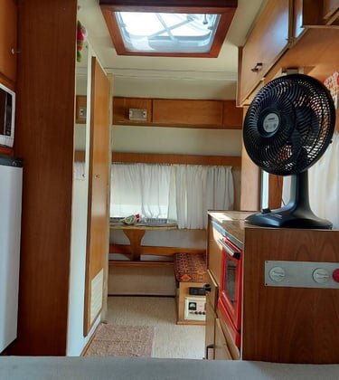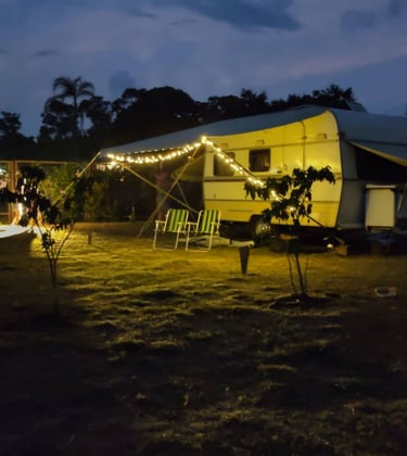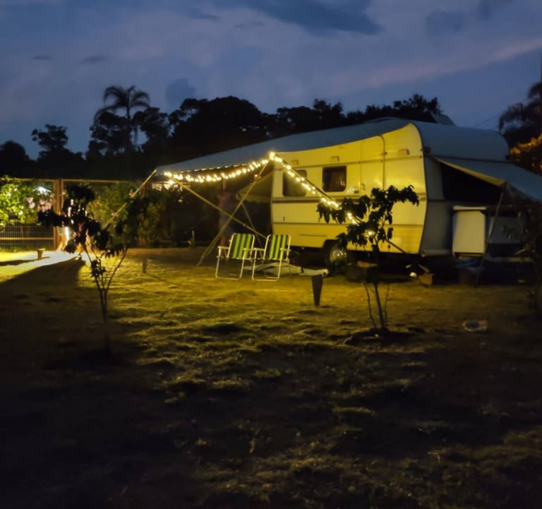 Também temos um trailer vintage disponível para locação. Este trailer é um verdadeiro charme, com um ampl deck e uma varanda aconchegante, além de banheiro e cozinha externa privativa.